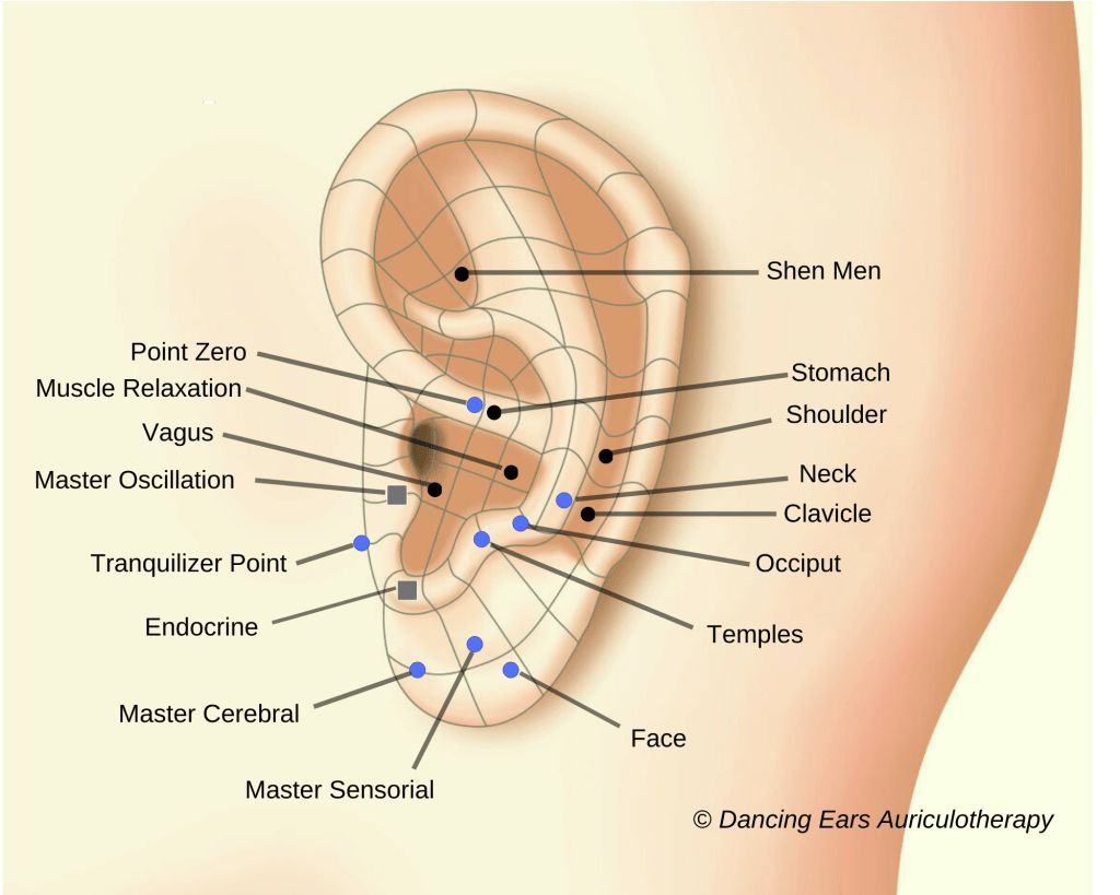 It’s best to start out with just a few points on the ear, rather than too many. Using this diagram, and the pointers for choosing points below (!) you can create a treatment. I use an ear probe or electrical devise to test responsiveness, but if you do not have an ear probe you can use a Q-tip to test points. If your subject has a headache when you do this, you should use light-to-medium pressure in order to avoid triggering more pain.